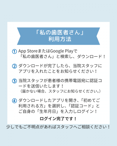 デジタル診察券「私の歯医者さん」へ移行いたしました。