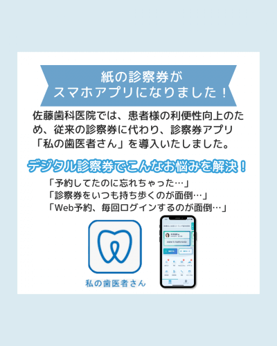 デジタル診察券「私の歯医者さん」へ移行いたしました。